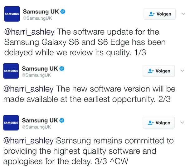 Teraz na Twitterze brytyjskiego oddziału Samsunga możemy przeczytać, że wysyłka aktualizacji Androida Nougat została opóźniona ze względu na brak pozytywnej oceny jej przez firmę. Niestety nie wiadomo, kiedy aktualizacja OTA może zacząć trafiać na pierwsze jednostki Galaxy S6 i Galaxy S6 edge. Przynajmniej wiemy, że Samsung pracuje nad nią i chce dostarczyć nowego Androida jak najszybciej będzie to możliwe.