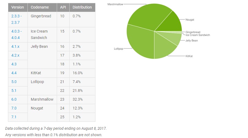 Jedynymi wersjami, które zaliczyły wzrost aktywnych urządzeń na rynku są Nougat i Marshmallow, zdobywając odpowiednio 2% i 0.5 %. Rzeczą jasną jest, że poprzednie wydania straciły swój „kawałek tortu” i i udział zmniejszył się o kilka punktów procentowych.