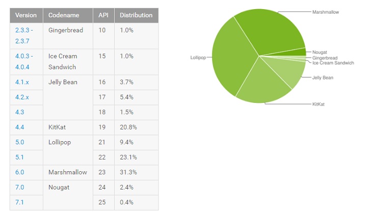 Android Jelly Bean nadal uzyskuje bardzo dobry wynik i stanowi 10,8 % wszystkich kompilacji mobilnego OS od Google. Ice Cream Sandwich and Gingerbread nadal utrzymują się na poziomie 1 procenta. Wynik Androida Nougat w ciągu najbliższych miesięcy powinien znacząco się poprawić, ponieważ na rynek trafi wiele urządzeń, które będą miał zainstalowaną właśnie tę wersję od samego początku.