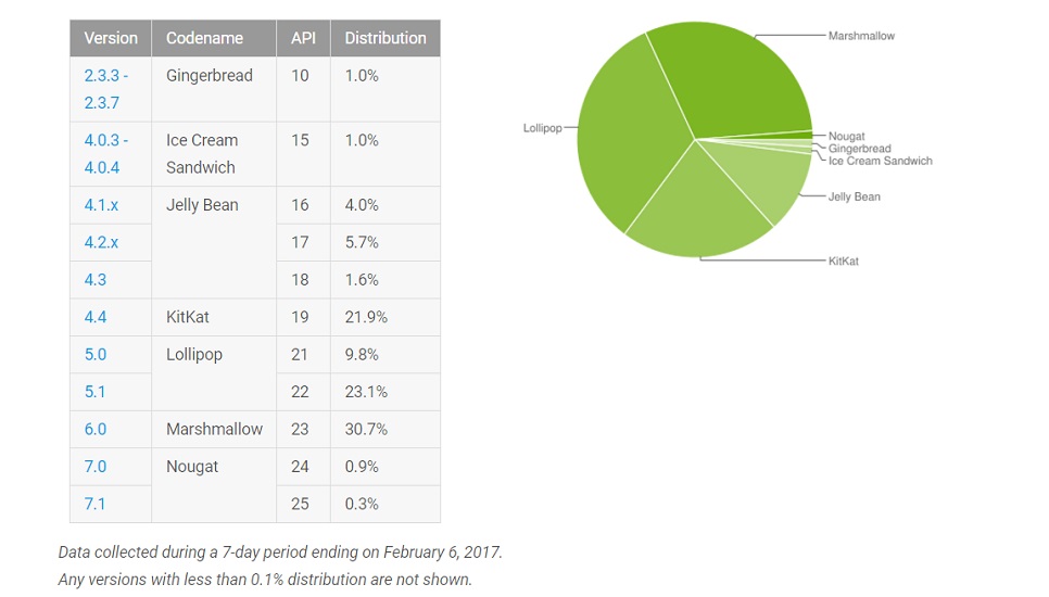 Drugim z kolejności jest Android 6.0 Marshmallow (30.7 %), który powoli dogania panującego Lollipop i za kilka miesięcy przegoni go w rankingu. Najciekawsze jednak, że po raz pierwszy granicę 1 procenta przekroczył Android Nougat – 7.0 posiada 0.9% urządzeń, a 7.1 – 0.3%, co daje ogólny wynik 1.2%.
