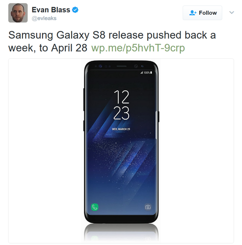 Evan Blass (@evleaks) przekazuje, że powodem opóźnienia jest niska wydajność produkcji chipsetów Snapdragon 835 i Exynos 8895. Istnieje również teoria, że Samsung chce jeszcze dokładniej wszystko zbadać pod kątem bezpieczeństwa, aby uniknąć fiaska jak w przypadku Galaxy Note 7.