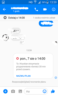 Planowanie możemy również rozpocząć w menu okna rozmowy, wciskając „Rozpocznij plan”. Do tego możemy zmieniać dowolnie godzinę, nazywać plan oraz dodawać jego lokalizację. Każdy z rozmówców otrzyma powiadomienie na 30 minut przed startem.