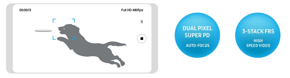 Samsung ujawnia kilka szczegółów na temat głównego aparatu na swojej stronie. Omawiane funkcje to autofokus „Super PD” oraz 3-warstwowy komponent FRS. Drugi z nich umożliwi nagrywanie filmów 1080p przy 480 fps. Oznacza to też nagrywanie wideo 720p przy 960 klakach na sekundę. Nowy czujnik ISOCELL jest wyposażony w autofokus Super PD (Supper Phase Detection). Zapewnia lepszą prędkość autofokusa nawet w warunkach słabego oświetlenia.