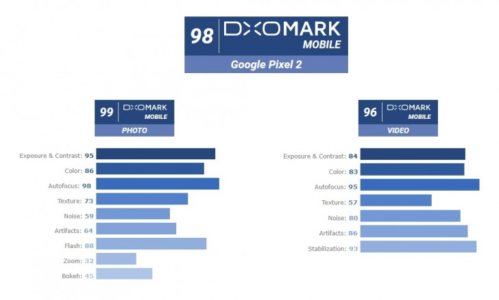 Google Pixel 2 zbiera również rekordowe 96 punktów w kategorii wideo. Chwalona jest przede wszystkim dobra ekspozycja, szybkość, gładki i stabilny autofokus przy śledzeniu przedmiotów i redukcja szumów. DxO zauważa ulepszoną stabilizację obrazu w porównaniu z poprzednimi modelami.
