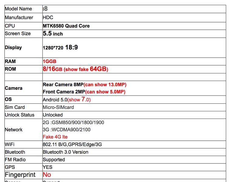 Pod maską pracuje chipset MediaTek MTK6580, 1 GB pamięci RAM, 16 GB pamięci wewnętrznej. Rozdzielczość wyświetlacza to 1280 x 720 (HD). Telefon oferuje łączność 3G. Lepiej wygląda sprawa oprogramowania, ponieważ jak już wspomniałem działa na Androidzie 5.0, a fałszywie podaje system Android 7.0. Jednak to nie wszystko, ponieważ pokazuje też nieprawdziwą sieć 4G LTE oraz pojemność 64 GB, a nawet parametry aparatów! Ciekawe czy zafałszowana została też identyfikacja twarzy.