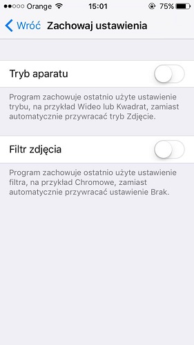 Jest też jedna mała i bardzo przydatna funkcja, która właściwie powinna być obecna już we wcześniejszych wydaniach iOS. Jest to Zachowanie ustawień aparatu. Jest to szczególnie przydatne, kiedy chcemy skorzystać z identycznej konfiguracji wykonując zdjęcia z poziomu zablokowanego ekranu w bardzo szybkim czasie.