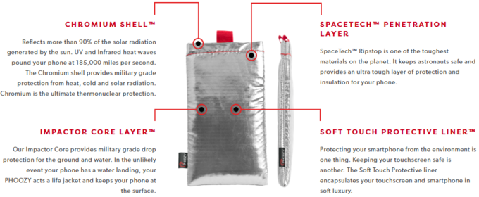 280" />Kapsuła została stworzona przez amerykańską firmę eXclaim IP, która inspirowała się technologią kosmiczną. Składa się ona z wielu warstw, a jej zewnętrzna powłoka wykonana jest z chromu, dzięki czemu odbija 90 % promieni słonecznych. Pozostałe trzy warstwy Phoozy Thermal chronią urządzenie przed wstrząsami, wraz z jego ekranem.