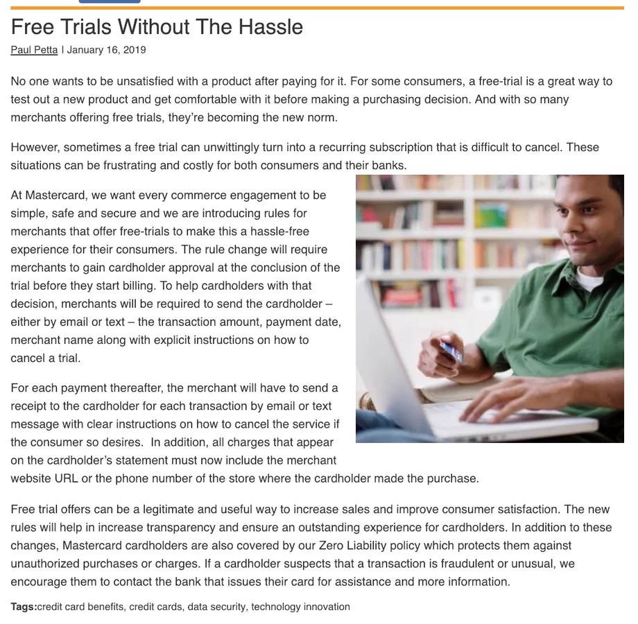 Wczoraj pojawiła się informacja, że MasterCard może uchronić nas od dodatkowych płatności po zakończeniu bezpłatnego okresu próbnego. Każdy pewnie choć raz niestety „nadział” się na taką sytuację i zapomniał anulować subskrybcję w odpowiednim czasie. MasterCard miał wprowadzić nowe zasady, gdzie przed pobraniem opłaty z naszej karty, musimy wyrazić na to zgodę.