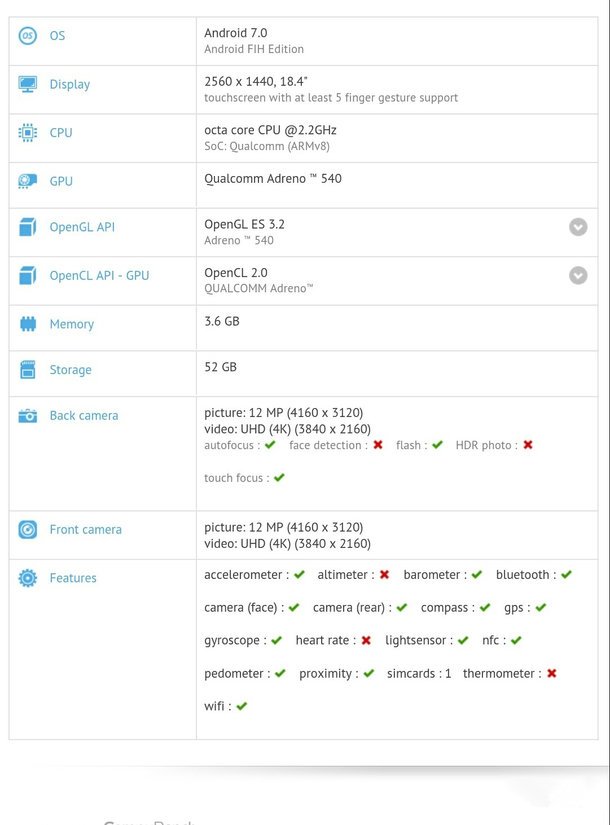 Benchmark wykazał, że tablet Nokii może być napędzany przez najpotężniejszy obecnie chipset Snapdragon 835 z procesorem o maks. Taktowaniu zegara 2.2 GHz oraz GPU Adreno 540. Urządzenie ma działać na Android 7.0 Nougat. Dalsze elementy specyfikacji to 4 GB RAM, 64 GB pojemności wbudowanej oraz aparat 12 MP z przodu i z tyłu. Tablet Nokii ma być wyposażony w technologie NFC, GPC oraz LTE. Mówi się również o dodatkowej fizycznej klawiaturze.