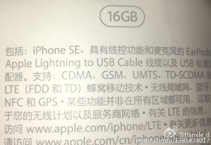 Jesteśmy już zaledwie 4 dni od premiery nowego 4-calowego iPhone spod skrzydeł Apple. Firma nie ujawniła żadnych szczegółów odnośnie tego smartfonu. Mimo to do sieci trafiało wiele przecieków, mniej lub bardziej prawdopodobnych. Tym razem na chińskim portalu Weibo pojawił się fragment opakowania, który wskazuje, że nowe urządzenie będzie nosiło nazwę „SE”. Wskazuje ono również jedną z wersji pojemności jaką będzie 16 GB.