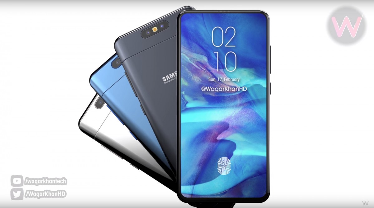 Wewnątrz urządzenia będzie pracował nowy chipset Snapdragon 7150. Samsung zastosuje w Galaxy A90 6,7-calowy wyświetlacz OLED Full HD+, który będzie działać również jako głośnik, aby pozbyć się zbędnego miejsca na otwór. Na wysuwanym panelu znajdziemy trzy aparaty – 48MP (f /2.0), 8MP (f /1.4) i ToF (f /1.2). Będą ona obracane i można je wykorzystać zarówno do robienia zdjęć z tyłu jak i z przodu.