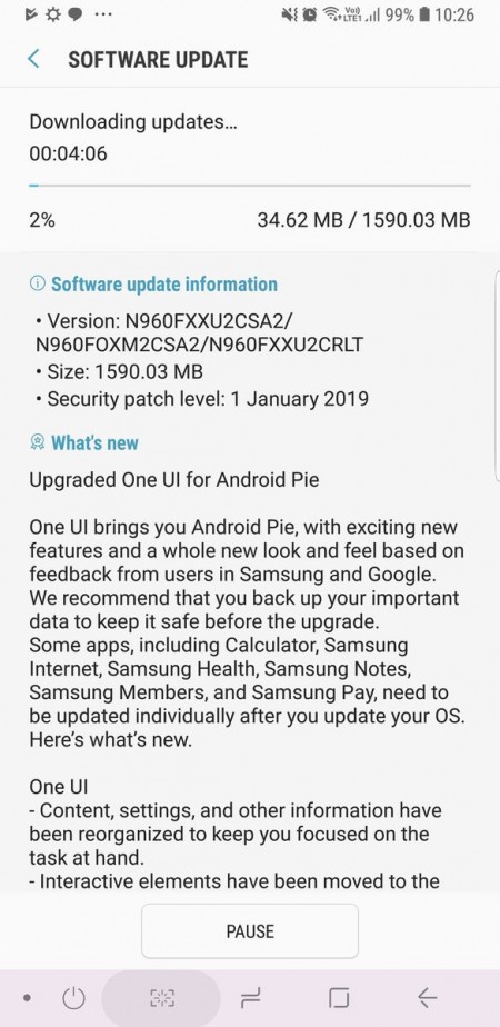 Z ZEA pochodzi kilka raportów od użytkowników, którzy dotychczas działali na Oreo i otrzymują powiadomienia o możliwości update’u do stabilnej wersji Pie. Oczywiście dostarczana jest z najnowszymi interfejsem One UI od Samsunga. Aktualizacja waży 1,6 GB, a numer kompilacji to N960FXXU2CSA2.