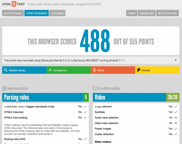 Samsung obecnie testuje prototypy Galaxy Note 8 z Androidem 7.1.1 Nougat na pokładzie. Odkryto to w bazie danych HTML5Test, gdzie znajduje się model Samsung SM-N950F. Prototyp został poddany testowi z przeglądarką Samsung Internet 5.2, gdzie udało się uzyskać 488 punktów na 555 możliwych.