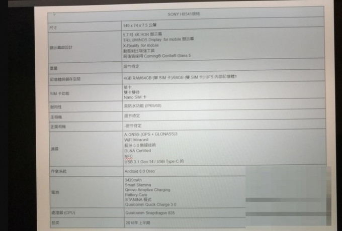 Zrzut ekranu ukazuje rzekomo arkusz specyfikacji niezapowiedzianego smartfonu Sony z numerem modelu H8541 prosto z Chin. Może to być flagowiec na 2018 rok z 5,7-calowym wyświetlaczem o rozdzielczości 4K i osłoną Corning Gorilla Glass 5. Wewnątrz ma pracować Snapdragon 835, 4 GB RAM i 64 GB pamięci wbudowanej.