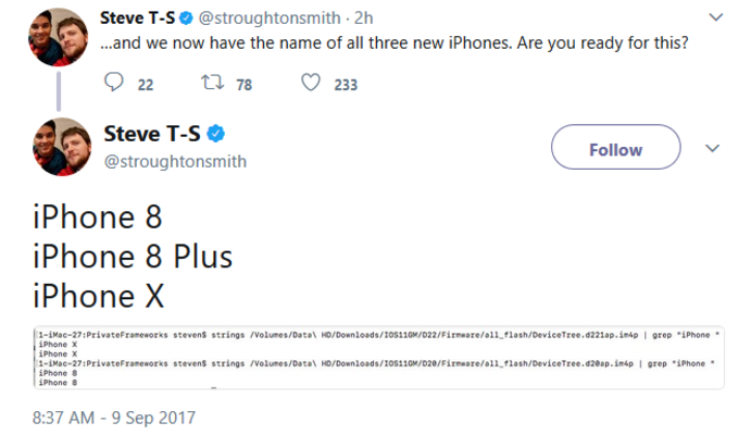 Programista Steven Troughton-Smith prześledził cały kod iOS 11 Golden Master, który ujawnia istotne szczegóły na temat nazewnictwa. Oprogramowanie iOS 11 GM zdradza, że jubileuszowy model zostanie ostatecznie nazwany Apple iPhone X, a pozostałe dwa Apple iPhone 8 oraz iPhone 8 Plus jak następcy iPhone 7 i 7 Plus.