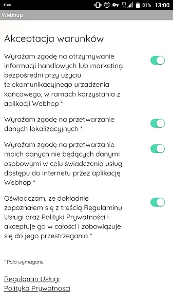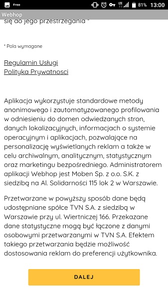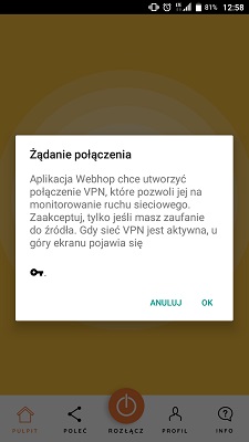 Po odpaleniu WebHop musimy zaakceptować wszelkie regulaminy, które możecie przeczytać sobie poniżej. Występuje wiele ciekawych punktów, ale przecież nie tylko my na tym mamy skorzystać dostając darmowy dostęp do internetu. WebHop tworzy połączenie VPN, aby nadzorować cały ruch.