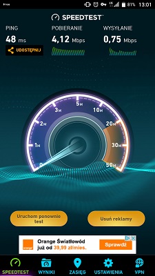 Prędkość na początku też wydaje się bardzo dobra jak na darmową (w zamian za swoje dane) usługę. Maksymalnie jest to 5 Mbps, ale z czasem prędkość ma spadać. Sprawdziłem i rzeczywiście można wyciągnąć te 5 Mb/s. Jednak do wysłania wiadomości na komunikatorze, czy wczytania pojedynczej strony jest to wystarczające. Twórcy nie informują ile trzeba wykorzystać, aby prędkość została zmniejszona.