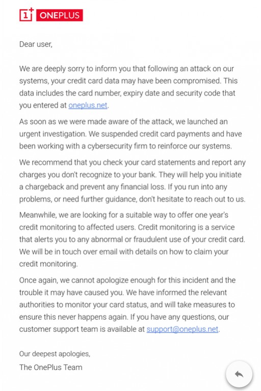 Wszyscy klienci, którzy dokonywali transakcji od listopada do 11 stycznia powinni sprawdzić historię swoich transakcji na rachunku podpiętym do karty kredytowej lub debetowej. OnePlus twierdzi, że dane zapisanych kart nie zostały wykradzione oraz nie dotyczy to też transakcji wykonanych za pośrednictwem PayPal z użyciem karty. OnePlus współpracuje z firmą zajmującą się bezpieczeństwem cybernetycznym, aby wzmocnić swoje systemy bezpieczeństwa. Przedstawiciel firmy wyjaśnia, że współpracują z dostawcami usług i władzami lokalnymi, aby lepiej zająć się incydentem.