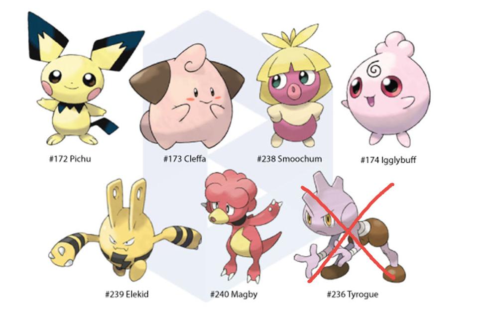 Magby (dziecko Magmara) Elekid, (zieckoElectabuzza) Cleffa, (ziecko Clefairy’a) Igglypuff, (ziecko Jigglypuffa) Pichu (ziecko Pikachu) Smoochum (ziecko Jynxa).